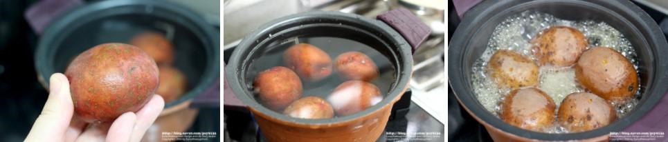 - 빨간감자는 껍질을 벗기지 말고, 감자가 반쯤 잠길 정도로 물을 넣어 중간 불에서 끓기 시작하면 약한 불에서 익을 때까지 삶습니다.