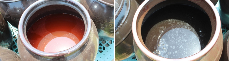 ** 정재춘 대표는 1년(왼쪽)과 6년 숙성된 항아리 속을 보여줬다. 색과 향이 확실히 달랐다. 사진=노진호 기자 **