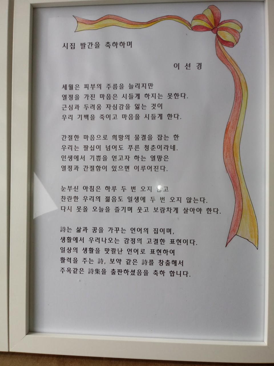 식사 후, 가족들이 번갈아 가며, 모친이 쓴 시를 낭송하는 시간을 가졌고, 울 엄니도 ‘축시’를 낭송하셨습니다. 반면, 저는 부끄러움과 부러움이 가득하였습니다.